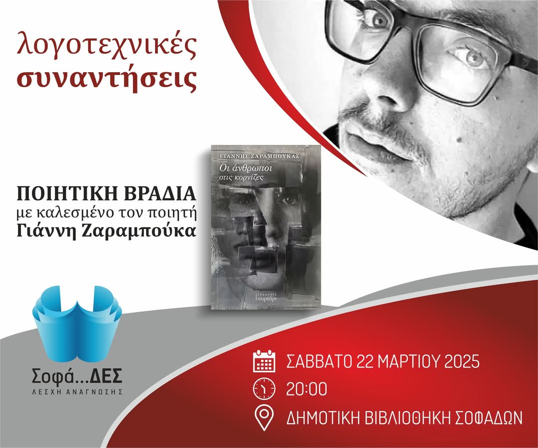 Η Λέσχη Ανάγνωσης Βιβλίου <Σοφά…δες!> τιμά την Παγκόσμια Ημέρα Ποίησης με μια αφιερωματική εκδήλωση το Σάββατο 22 Μαρτίου 2025 στις 8:00μμ στον χώρο της Δημοτικής Βιβλιοθήκης Σοφάδων. Καλεσμένος της Λέσχης, ο ποιητής Γιάννης Ζαραμπούκας με την συλλογή ποιημάτων του που φέρει τον τίτλο ‘Οι άνθρωποι στις κορνίζες’ από τις Εκδόσεις Συρτάρι. Η εκδήλωση θα πλαισιωθεί από την …