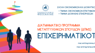 Το Τμήμα Διοίκησης Επιχειρήσεων και το Τμήμα Οικονομικών Επιστημών του Πανεπιστημίου Θεσσαλίας καλούν τους ενδιαφερόμενους/τις ενδιαφερόμενες να υποβάλουν υποψηφιότητα για την παρακολούθηση του Διατμηματικού Προγράμματος Μεταπτυχιακών Σπουδών (ΔΠΜΣ) «Επιχειρηματικότητα» για το ακαδημαϊκό έτος 2024-2025. Οι μεταπτυχιακές σπουδές στην «Επιχειρηματικότητα» οδηγούν στη λήψη Μεταπτυχιακού Διπλώματος Ειδίκευσης μετά από φοίτηση δύο (2) εξαμήνων (πλήρους εντατικής φοίτησης) ή τεσσάρων (4) εξαμήνων (μερικής …