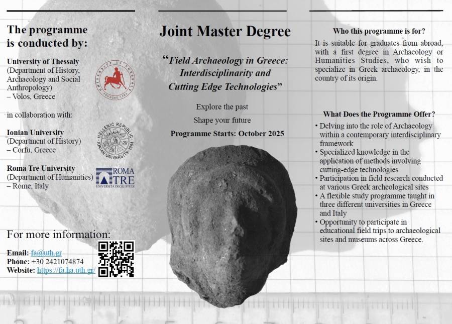 Το Πανεπιστήμιο Θεσσαλίας ανακοινώνει με ιδιαίτερη χαρά την έναρξη του νέου Αγγλόφωνου Μεταπτυχιακού Προγράμματος Σπουδών του Τμήματος Ιστορίας, Αρχαιολογίας και Κοινωνικής Ανθρωπολογίας, με τίτλο “Field Archaeology in Greece: Interdisciplinarity and Cutting Edge Technologies”. Το πρόγραμμα, που θα ξεκινήσει τον Οκτώβριο του 2025, έχει σχεδιαστεί για να προσελκύσει ξένους φοιτητές από όλον τον κόσμο, οι οποίοι ασχολούνται με την Αρχαιολογία και τις Ανθρωπιστικές Επιστήμες. Οι δια …