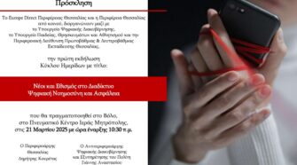 Το Europe Direct Περιφέρειας Θεσσαλίας και η Περιφέρεια Θεσσαλίας, σε συνεργασία με το Υπουργείο Ψηφιακής Διακυβέρνησης, το Υπουργείο Παιδείας, Θρησκευμάτων και Αθλητισμού και την Περιφερειακή Διεύθυνση Πρωτοβάθμιας & Δευτεροβάθμιας Εκπαίδευσης Θεσσαλίας, διοργανώνουν Κύκλο Ημερίδων με θέμα «Νέοι και Εθισμός στο Διαδίκτυο, Ψηφιακή Νοημοσύνη και Ασφάλεια». Στις Ημερίδεςθα συμμετάσχουν μαθητές Δευτεροβάθμιας Εκπαίδευσης σχολείων της Θεσσαλίας και …