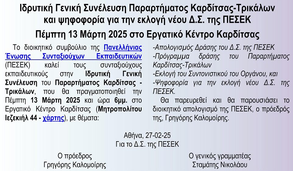 Το διοικητικό συμβούλιο της Πανελλήνιας Ένωσης Συνταξιούχων Εκπαιδευτικών (ΠΕΣΕΚ) καλεί τους συνταξιούχους εκπαιδευτικούς στην Ιδρυτική Γενική Συνέλευση του Παραρτήματος Καρδίτσας – Τρικάλων, που θα πραγματοποιηθεί την Πέμπτη 13 Μάρτη 2025 και ώρα 6μμ. Στο Εργατικό Κέντρο Καρδίτσας, με θέματα: -Απολογισμός πεπραγμένων του απερχόμενου διοικητικού συμβουλίου -Οικονομικός απολογισμός -Εκλογή του Συντονιστικού του Οργάνου, και -Ψηφοφορία για …