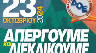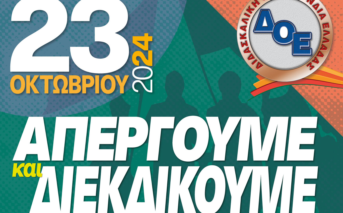 Δυναμώνουμε τον διαρκή αγώνα για ουσιαστικές αυξήσεις στους μισθούς μας, για ικανοποίηση των μορφωτικών αναγκών των παιδιών μας για δημόσια και δωρεάν παιδεία απέναντι στην εμπορευματοποίηση,κατηγοριοποίηση και διαφοροποίηση σχολείων – μαθητών – εκπαιδευτικών που επιχειρεί η κυβέρνηση της ΝΔ. Συναδέλφισσες, συνάδελφοι, το Δ.Σ. της Δ.Ο.Ε. καλεί τον κλάδο σε 24ωρη απεργία στις 23 του Οκτώβρη! …