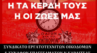 Συνάδελφοι οικοδόμοι, εργαζόμενοι στις Κατασκευές, άνεργοι, μετανάστες, Η 1η Μάη είναι μέρα των εργατών όλου του κόσμου. Σηματοδοτεί τον αγώνα της τάξης μας για έναν κόσμο χωρίς εκμετάλλευση ανθρώπου από άνθρωπο, χωρίς φτώχεια, πολέμους και προσφυγιά. Έναν κόσμο όπου πραγματικά εμείς και τα παιδιά μας θα μπορούμε να ζούμε όπως μας αξίζει. Ο εορτασμός της …