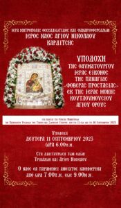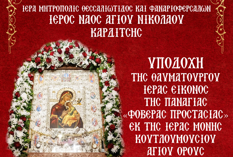 Τη θαυματουργή Ιερά Εικόνα της Παναγίας Φοβεράς Προστασίας, που έρχεται από την Ιερά Μονή Κουτλουμουσίου του Αγίου Όρους, θα υποδεχθεί τη Δευτέρα 11 Σεπτεμβρίου η πόλη της Καρδίτσας.