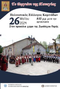 Ο Πολιτιστικός Σύλλογος Καμινάδων σας προσκαλεί στο «Σεργιάνι της Παναγίας» που θα πραγματοποιηθεί την Κυριακή 26 Μαΐου 2024 στις 20.30 στον προαύλιο χώρο της εκκλησίας Ζωοδόχου Πηγής, αμέσως μετά την αρτοκλασία.