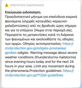 «Προειδοποιητικό μήνυμα για επικίνδυνα καιρικά φαινόμενα (ισχυρές καταιγίδες-κεραυνοί-χαλαζοπτώσεις) από τις βραδινές ώρες σήμερα και για το επόμενο 24ωρο στην περιοχή σας. Περιορίστε τις μετακινήσεις κατά τη διάρκεια των φαινομένων και ακολουθήστε τις οδηγίες των αρχών. Οδηγίες αυτοπροστασίας: https://civilprotection.gov.gr/odigies-prostasias/genikes odigies. Warning message about severe weather conditions (thunderstorms-hailstorms) since evening hours today and for the next 24 hours in your area. Limit any movement during the phenomena.Protection guidelines: https://civilprotection.gov.gr/112/all-guidelinesΖ»