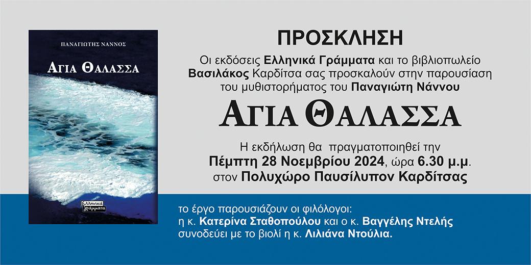 Το νέο μυθιστόρημα του Παναγιώτου Νάννου και δημάρχου Λίμνης Πλαστήρα με τίτλο «Αγία Θάλασσα» θα παρουσιαστεί στο «Παυσίλυπο» της Καρδίτσας, την Πέμπτη (28/11/2024) και ώρα 6.30 μμ. Την εκδήλωση οργανώνουν οι εκδόσεις «Ελληνικά Γράμματα», του βιβλιοπωλείου «Βασιλάκος».