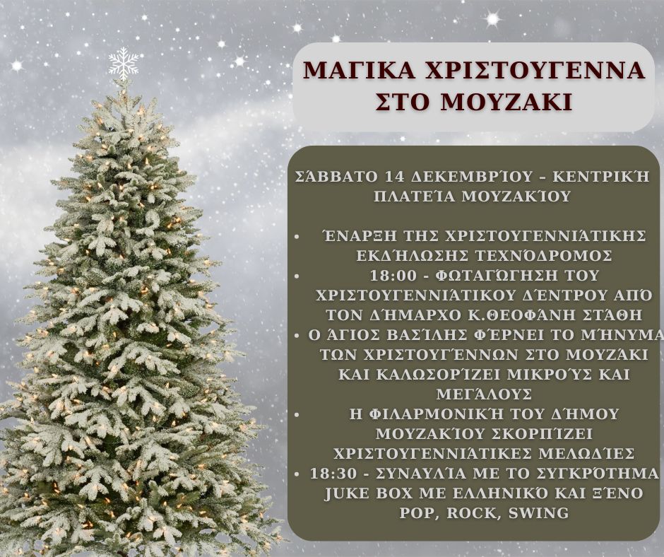 Ο Δήμος Μουζακίου σας προσκαλεί το Σάββατο 14 Δεκεμβρίου στις 18:00 μ.μ. στην Κεντρική Πλατεία Μουζακίου, για τη φωταγώγηση του Χριστουγεννιάτικου Δέντρου.