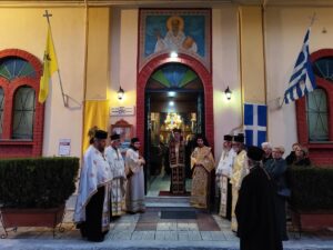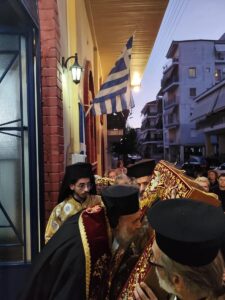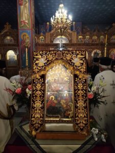 Εμείς απόψε εδώ εορτάζουμε και υποδεχθήκαμε την Ιερά Εικόνα της Παναγίας της Δίζωνης από την Ιερά Μονή Παναγίας Πετριλίων, του Γενεσίου της Θεοτόκου και τελούνται αυτές οι Ιερές Ακολουθίες εις ανάμνηση των Εγκαινίων του Ιερού Ναού, ο οποίος εγκαινιάστηκε και στην Αγία Τράπεζα τοποθετήθηκαν μαρτυρικά λείψανα Αγίων, οι οποίοι έχυσαν το αίμα τους για την πίστη τους εις τον Ιησού Χριστό, και παράλληλα καθιερώθηκε ο Ιερός Ναός δια Αγίου Μύρου.