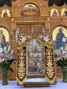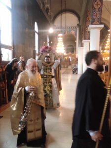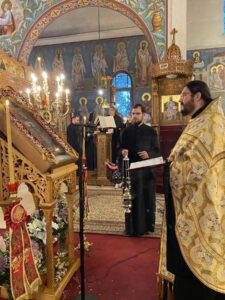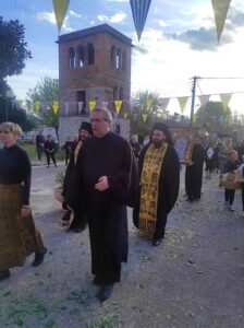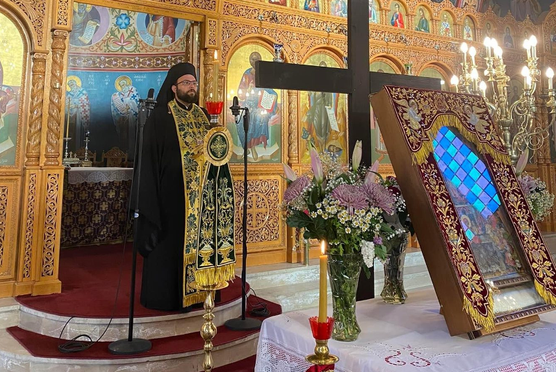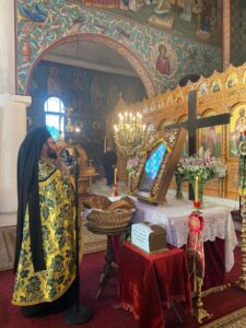 Έγινε και η περιφορά του Τιμίου Σταυρού εντός του Ιερού Ναού με εξαπτέρυγα, ψάλτες και τον Τίμιο Σταυρό επάνω στα λουλούδια, που κρατούσε ο προϊστάμενος του Ιερού Ναού.