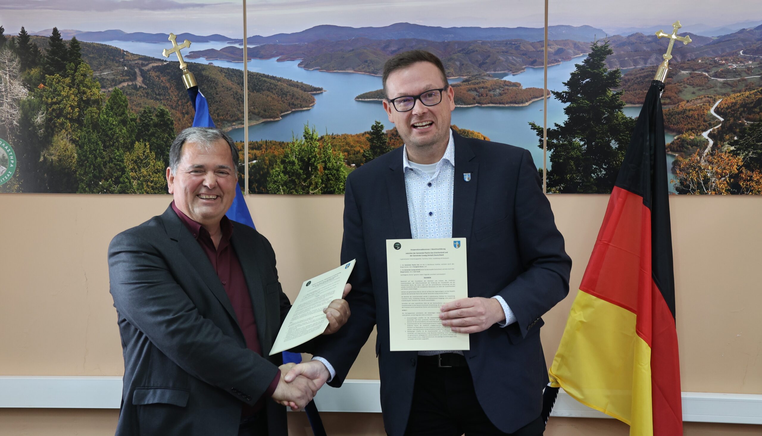 Σημαντική συμφωνία συνεργασίας υπέγραψαν σήμερα (Πέμπτη 30/3/2023) στο Μορφοβούνι, οι δήμαρχοι κ.κ. Παναγιώτης Νάνος και Axel Clauß, με εκπρόσωπο της Ελληνο – Γερμανικής Συνέλευσης και μεταφράστρια κ. DenizSakkoleva, παρουσία του προέδρου των συνεργατών των δύο δημάρχων που θα υλοποιήσουν την συμφωνία, καθώς και των αντιδημάρχων Δήμου Λίμνης Πλαστήρα. Η υπογραφή του MoU είναι το αποτέλεσμα τηλεδιασκέψεων των δημάρχων Λίμνης Πλαστήρα και Coswig (Anhalt) Γερμανίας, με διαμεσολαβητή στην επικοινωνία και συνεργασία την Ελληνογερμανική Συνέλευση, φορέα της Αυτοδιοίκησης και εταίρο της κοινής προσπάθειας.